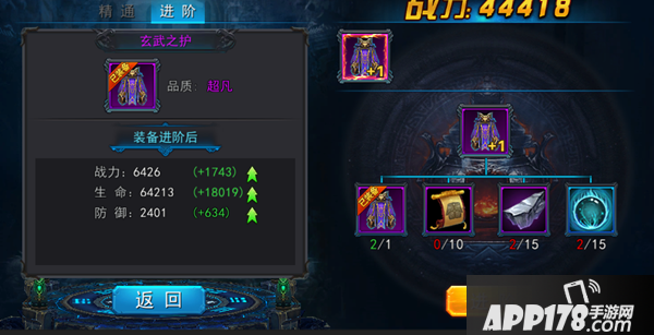 进阶界面,每一件装备都能进行进阶,前提是你要进阶所需要的材料,另外当前版本的进阶几率是100%,这对玩家来说是一个福音,每次进阶的战力提升的都是相当大的,各位要多多努力!