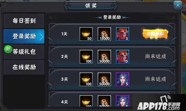 4.登陆后,领奖里面有丰厚的奖励,有登录奖励,签到奖励,在线奖励,等级礼包。里面各种福利可以领取,千万要领取。