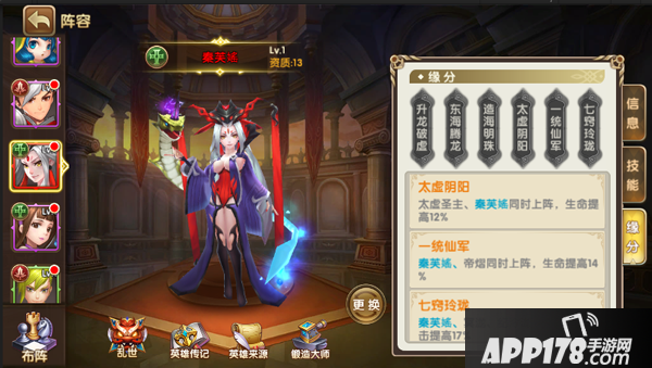 照例首先是缘分,秦芙媱的缘分大多数也和正面人士有关,毕竟她确实一直扮演正面角色,到最后才摊牌=。=与她有缘分的英雄多达4个,当然,基本上都是橙色以上的英雄,想凑齐缘分可不容易哦。