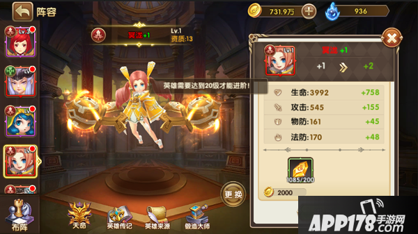 并不是只要满足进阶材料都可以进阶的,进阶也需要英雄自身满足特定的等级条件,如下图冥泷只有1级的时候是无法进阶到+2的,必须升到20级才行。