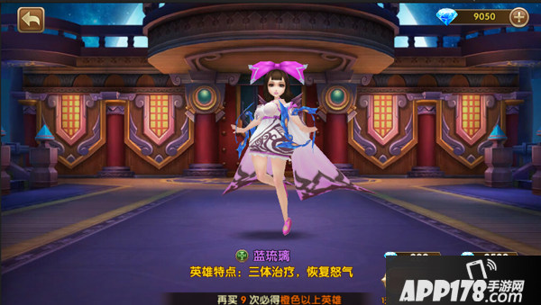 呀,抽到了紫色英雄蓝琉璃,可惜这个英雄主线已经送过了(偷偷拿去升阶)。反正钻石还多,那就来一发激动人心的十连啦!注意看,十连可是保底有一个橙色英雄的哦~