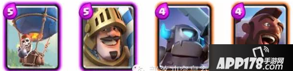 这四张卡牌都是对建筑构成极大威胁的卡牌,其中气球兵配合冰冻法术,可以一波推掉护卫塔;王子在冲锋后,如果无单位阻挡,第一下攻击所造成的双倍伤害,对塔的伤害也是极其巨大的;迷你皮卡类似于王子,单体爆发伤害非常可观;最后是野猪骑士,虽然爆发能力不及前三张卡牌,但是它的攻击目标是建筑,且移动速度快,还可以直接跳跃河道,配合冰冻法术效果显著。