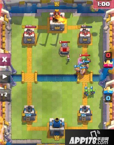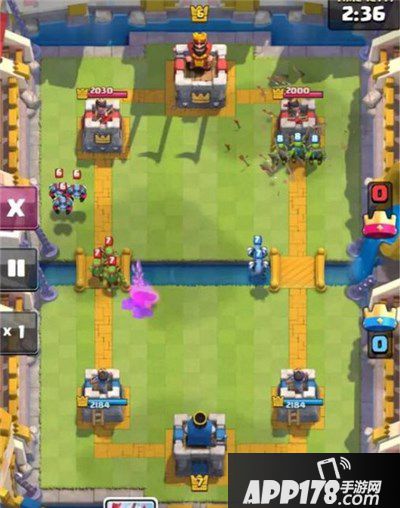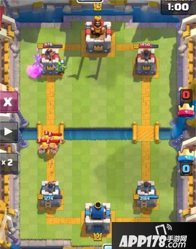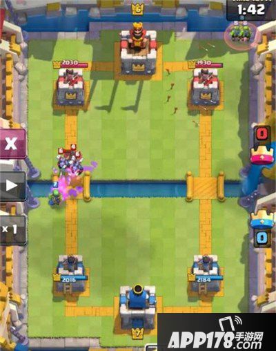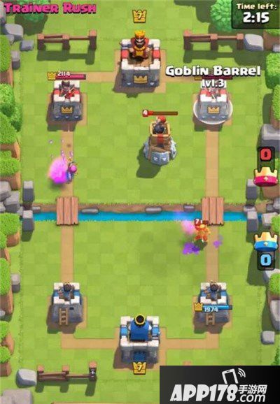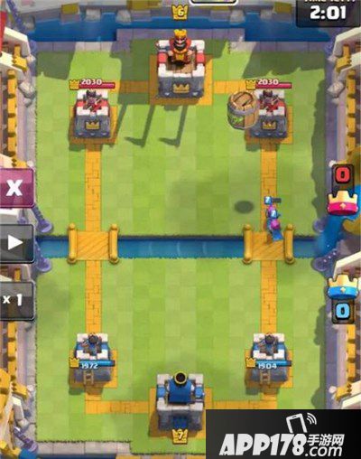 接下来第四个桶,我选择右护卫塔,让哥布林分在塔的三个方向的标准丢法,这个时候对方手上没有万箭齐发,选择用部队卡牌速清,塔又掉了约500血。