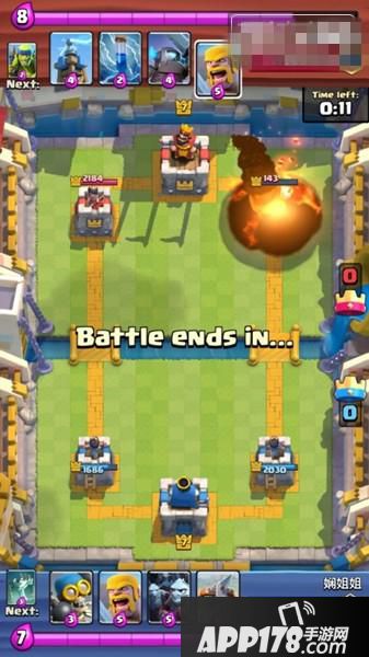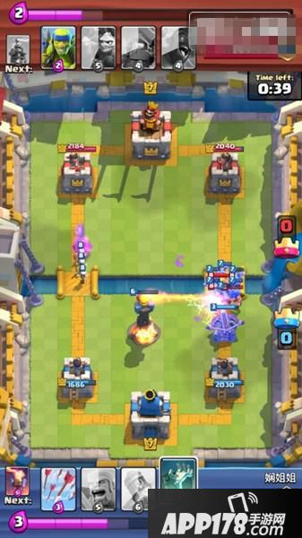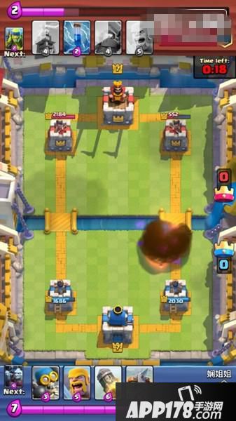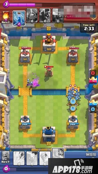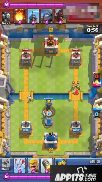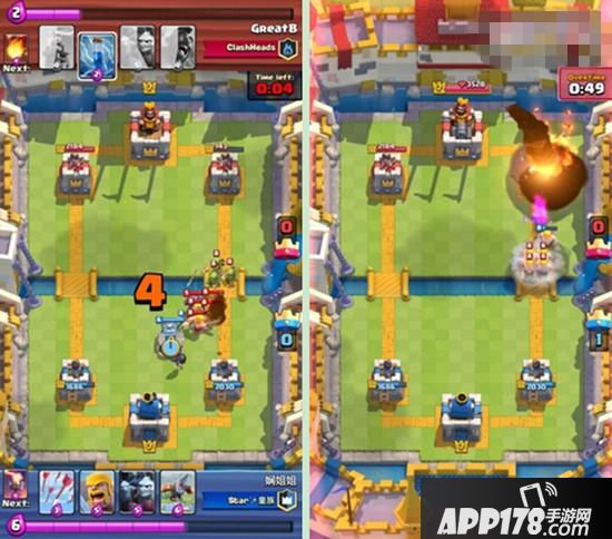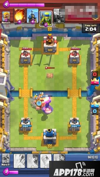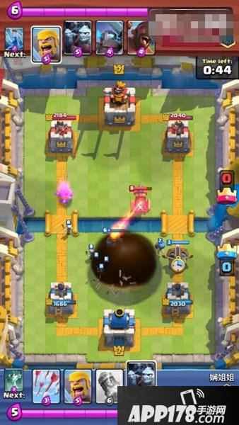 下了地狱塔、墓碑之后,对方一直没有发动进攻,我方满费时手里是箭雨、黄毛、大火箭、炸弹人,下一张牌是弩。所以我们塔后下炸弹人过牌+攒费,手里拿到连弩后的下一张牌是恶魔海。这时我们心里要清楚,又攒齐一套,如果对方用费下电塔或火球砸我们的话,那么这是一个非常好的进攻时机,因为我们还有个炸弹人。这时因为我们场上的地狱塔和墓碑,对面果然没有进攻而是贴河道下了个电塔,同时又用火球砸掉我们的地狱塔和墓碑。等手里9费半时,果断下连弩+恶魔海。