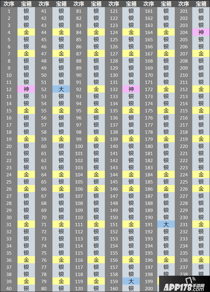 战斗胜利后掉落的宝箱是固定的。每240场一循环。胜利但没有空位的情况不计算在内,序列里的下一个宝箱会在下一次有空位的时候掉落。