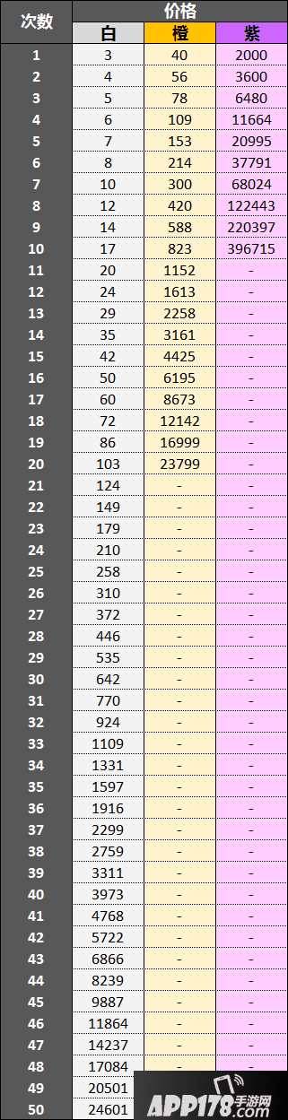 (白卡每购买一次,价格就乘以1.2。橙卡乘以1.4。紫卡乘以1.8)