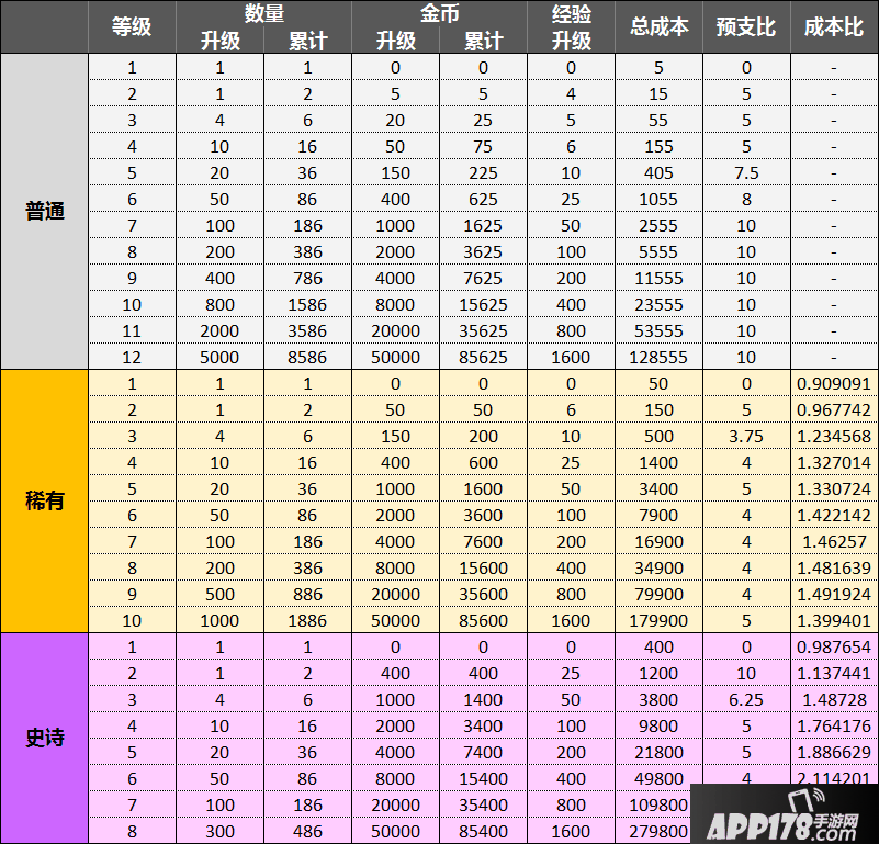 表格中的“预支比”就是升级金币的体现。具体来说就是该等级下,每张卡片(换算成白卡)均摊的升级费用。例如白卡从7升8需要200张卡片,升8的时候需要2000金币,那么平摊下来就是每张卡需要额外2000/200=10金币来升级。假如按照参照价格1张白卡=5金币,那么算上升级金币,在这次升级过程中其实每张白卡需要15金币。