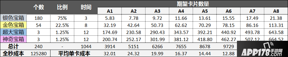 期望卡片数量的数据来源于上文的宝箱表,乘上宝箱个数后得到周期总计卡片数量,再用成本除之就得到了平均单卡成本