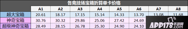 最终得到的单卡价格就是该宝箱的性价比,单卡价格越低说明性价比越高。楼主把商城宝箱的部分单独整理成表格方便观看: