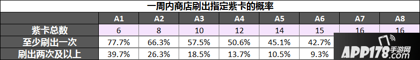 即使A7、A8解锁全部紫卡,一周之内刷出你想要紫卡的概率也是很可观的,更有不算太渺茫的概率刷出2次以上。