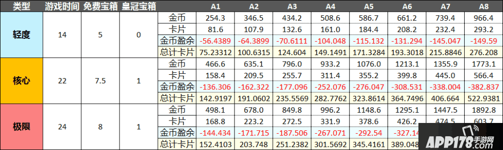 假设本人是个核心玩家,目前在A5,那么我通过以上各种宝箱,平均每天收入的金币就是1076,平均每天收入的卡片就是355.2(各种卡折合成白卡)。