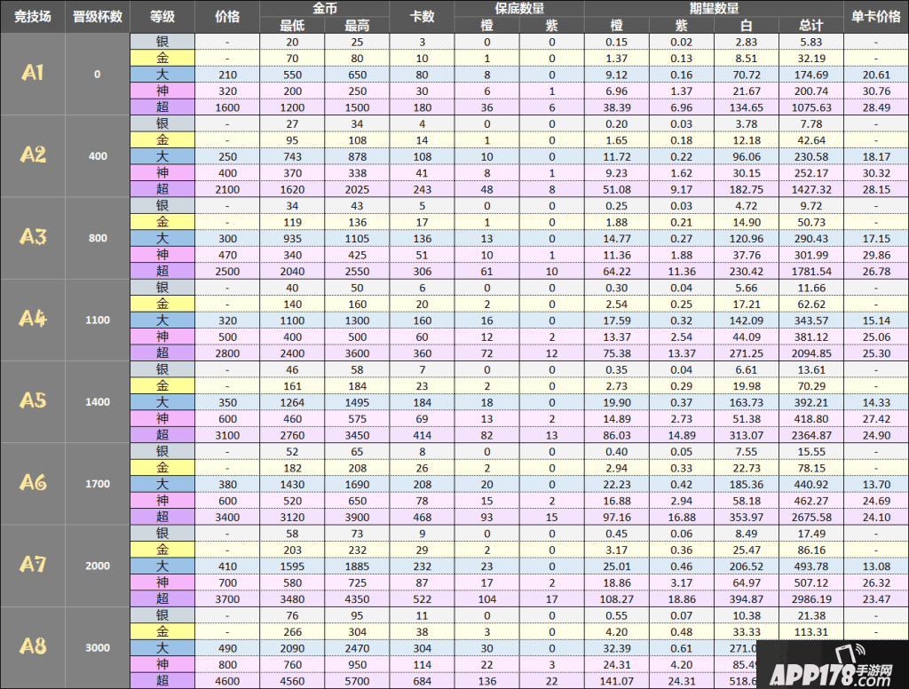 例如假如有一种宝箱花费3000金币得到50张白卡+10张橙卡+1张紫卡,那么总卡数就是50*1+10*10+1*80=230,单卡价值就是3000/230=13.04