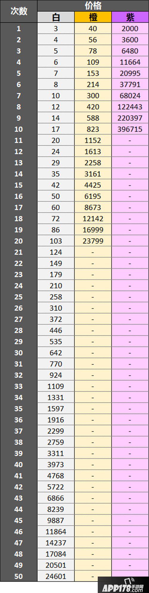 (白卡每购买一次,价格就乘以1.2。橙卡乘以1.4。紫卡乘以1.8)