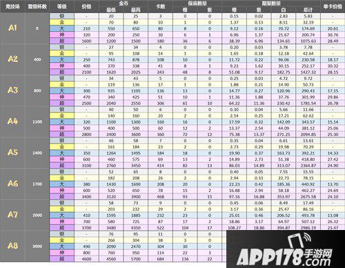 可以看出,从A5开始,秒时间的性价比已经达到或超过直接买超大。紫卡出现率也比超大高,所以A5开始买超大不如秒时间。当然如果要秒整个周期,就不能只算时间而忽略战斗胜利了。不过对于零微氪玩家,攒钻买超大就不如平时没事秒秒时间了。