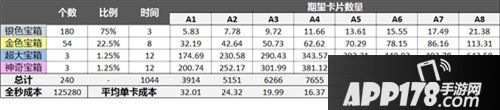 至于缺失的数据,金银箱的紫卡概率设定成橙卡概率的1/8,超大的紫卡概率设定成1/500(因为A8超大304张无保底紫卡所以小于1/304,500这个数纯属脑补)