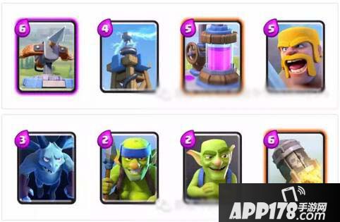 XB、一个防御塔(特斯拉电磁塔,加农炮,地狱之塔)、圣水采集器、野蛮人、万箭齐发/火球、亡灵、哥布林投矛手、哥布林、以及最多1-2个可以独立进攻的卡(火箭、雷电法术居多)。