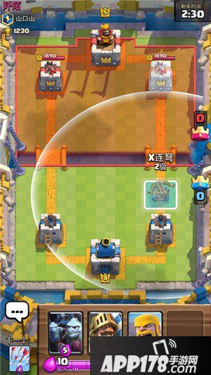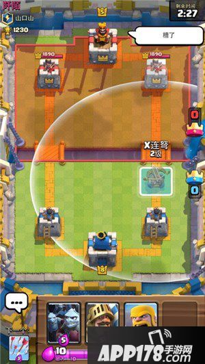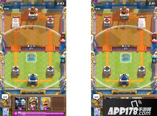 由于弩的射程修改,其站位只能站在一个靠近桥头的偏斜的位置,给我们提供了更好的突破口,火枪手飞龙等单位也可以站在侧塔射程外早早的攻击X弩,而野蛮人也能快速跑到X弩旁攻击。