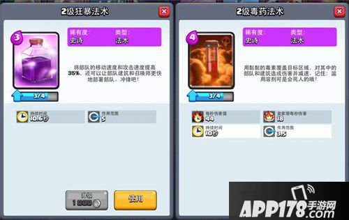 这两张法术的出场率都不高,因为狂暴法术显得功能单一比较尴尬,毒药法术的伤害类型尴尬,如果是针对生物的话没有爆发,慢慢地解场显然不是我们的追求,针对建筑呢又太过低能,4费的输出显然并不划算。