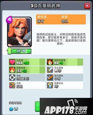 女武神的卖点有二,其一是解骷髅海和野蛮人,能够陪同主输出单位前进,用来解决各式各样的群体生物解,其二是能够一边打塔一边输出小兵,那么在进攻端的时候可以减弱对方防守反击的能力。