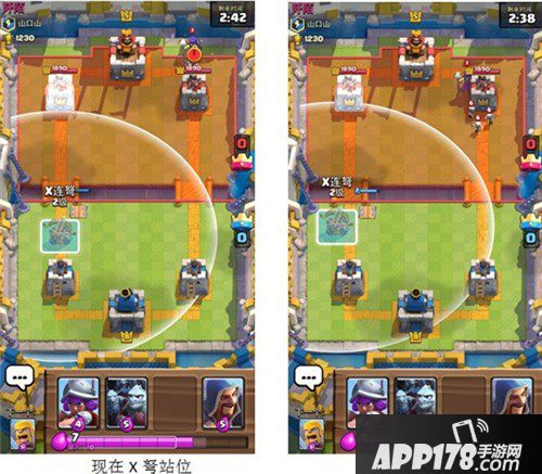 这个位置的弩几乎就站在了桥头了,那么对X弩的整个布局影响很大,首先,弩的防守变得更难,而我们拥有更多去突破弩的可能性,其次,X弩的打法中,电塔也会站在其旁,而这个位置显然就会影响到电塔的站位,童鞋们可以看我做的对比图如下: