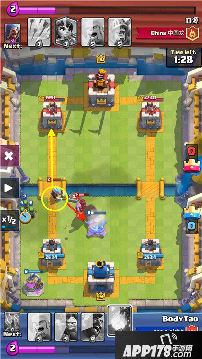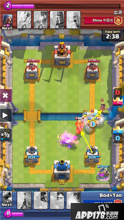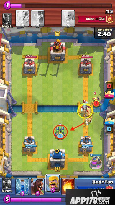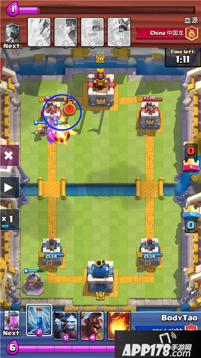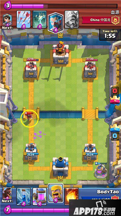 这里,我下哥布林把王子引诱到中间,然后用黄毛骑脸,一举三得:1.杀冰法。2.杀公主。3.引诱王子,让箭塔持续输出。