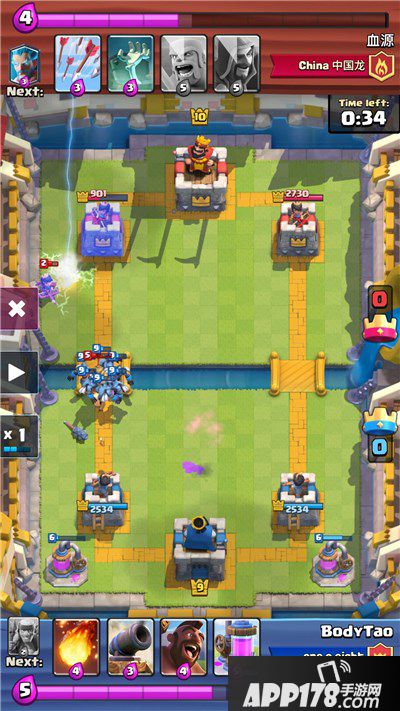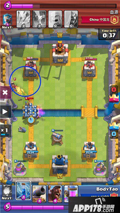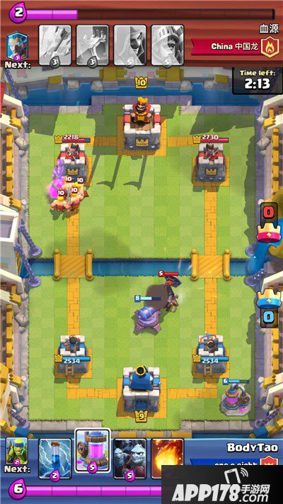 骑完法师,继续进攻,对面放下墓碑+冰法。我就等黄毛把墓碑拆掉之后,小闪电下去,杀掉小骷髅+打晕电塔和冰法,让黄毛再摸几下塔。
