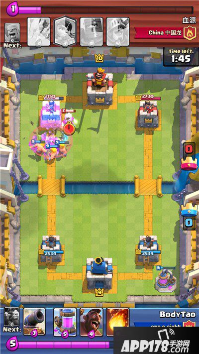 但是这时对面几乎同时下了黑暗王子。嘻嘻嘻,小土炮完虐之。这里是我个人的小经验:黑暗王子虽然也有冲锋但是伤害比不上王子,不过AOE伤害导致用兵来挡会十分的亏,所以用小土炮的话,这个AOE可以忽略,再加上箭塔射射射,我的土炮还没爆呢,就跪下了。