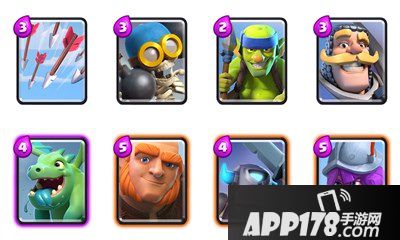 骑士、弓箭手/哥布林投矛手、炸弹人、箭雨、小皮卡、巨人、火枪手、飞龙宝宝。