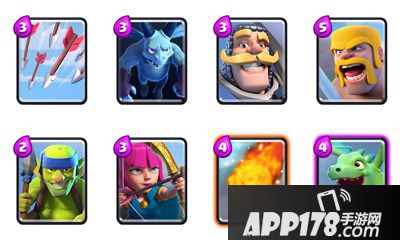 攻守兼备型卡组(中杯段):飞龙宝宝+火球+野蛮人+骑士+万箭齐发+亡灵+哥布林投矛手+弓箭手