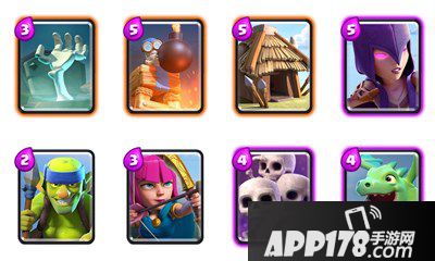 建筑流卡组(中杯段):飞龙宝宝+女巫+炸弹塔+骷髅墓碑+哥布林小屋+哥布林投矛手+骷髅军团+弓箭