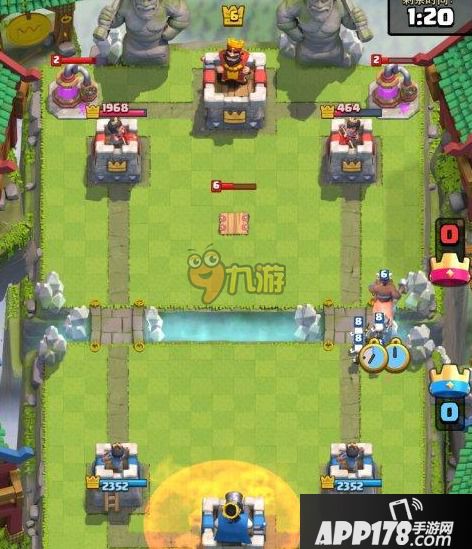 冰猪流战术的核心进攻组合,如果起手就有这两张牌,推荐在圣水7.5格的时候,在桥下的中央位置下猪,然后提前拖动冰冻的作用区域,先别放手。
