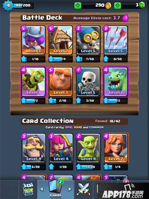 3、目前CR,金币绝对不会过剩,可以用金币在每日商店购买白,橙,紫卡牌;卡牌升级也需要消耗金币,花费只需5,20,50金币的卡牌随意升级。之后,你就需要斟酌,根据你使用卡牌以及主流卡组用到卡牌的情况,有优先级的升级卡牌了。因为后期卡牌升级金币消耗相当高,白卡6-7需要1000,7-8需要2000金币哦!当然这都是后话了。