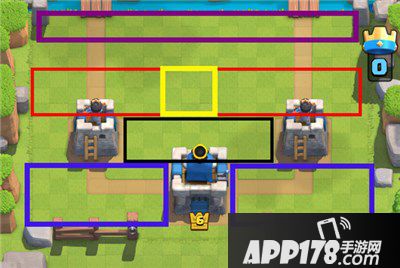 但是当玩家的圣水即将到达10点的时候,敌人仍然没有动静的话,我们可以适当地派出先遣部队进行试探。在下图蓝色区域投放哥布林、长矛哥布林、小骷髅任意一种都是前期合理的试探手段,如果手上刚好都没,则在黑色、蓝色区,往自己想要攻击的一边放下任意一种的兵营(优先建议墓碑)。