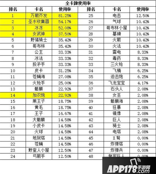连弩削弱后基本没人用了,顶峰很少见人海战术,因此炸弹塔也没人用了,目前A6-A7很多迫击炮流,网上也有很多文章吹能上3000,但实际统计极少使用,也许已经被破解了吧(小编目前的牌组就是克死迫击炮的)。