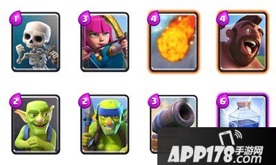 而小骷髅这张牌则是一张纯粹用来防御,过牌,牵制,遛狗的牌,不到最后一定要去抢血或者无牌可用必须过牌的情况下不要主动交来进攻,在双骑或女武神很多的环境下可用骑士替换。近战哥布林的使用非常灵活,基本在对方兵种锁定其他目标时可以秒解,过跟在野猪后面迅速输出公主塔,是一张威胁性和灵活性都很强的牌。同理远程哥布林也是一样,远程哥布林事实上是这张牌第二大输出兵种,残血时候蹭血,过牌,杀公主,防亡灵,挡王子冲锋,基本上也是一张万能牌。
