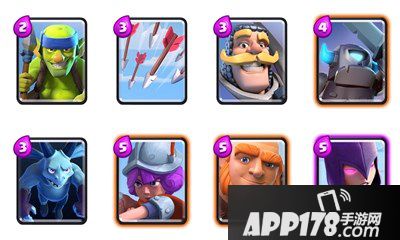 我这边卡组:3级骑士、3级哥布林投矛手、1级小皮卡、3级箭雨、3级亡灵、2级巨人、2级火枪手、2级女巫。3本223卡组。