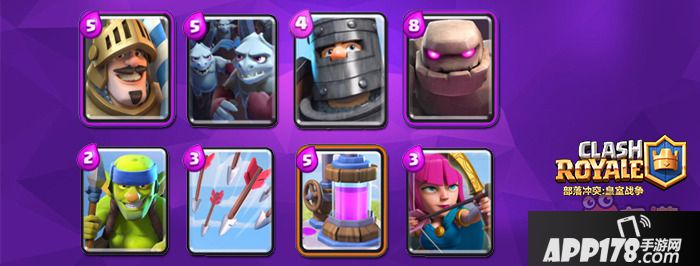 这套有两个进攻核心:戈伦石人和黑白皇子。辅助进攻则由两种弓箭手和六个核桃来补充。加速罐帮助套牌运转,箭雨补充AOE。整体构成完善而和谐。"坦克+弓箭手"这种单纯而有效的组合,永远都是适用的。