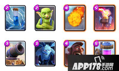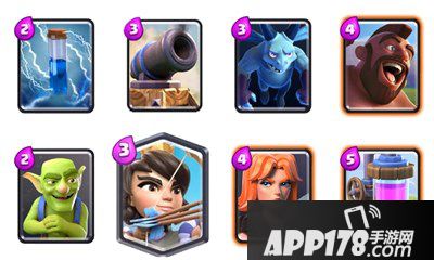 除了猪、哥布林和小闪电不能替换,其他都可以自己斟酌,例如小苍蝇换苍蝇群、地狱塔换小骷髅等。白卡等级8级即可,但小闪电最好9级(因为8级小闪电不死9级近战哥布林,这点很关键)橙卡猪建议6级,其他5级即可。