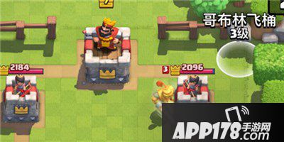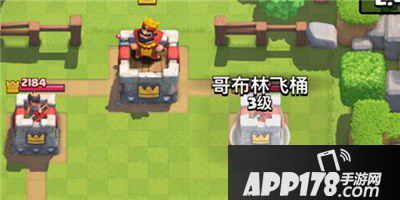 有塔下塔,炸弹塔优先。有桶就丢桶试探。桶的标准扔法是完美覆盖对方防御塔,如此扔法可使三只哥布林呈三角围攻对方防御塔,使对方不能使用兵种很快解掉。如果对方使用剑雨秒解也没关系,下次改变方法,扔角落就可以了。我将这种扔桶方法称为“心机桶”。