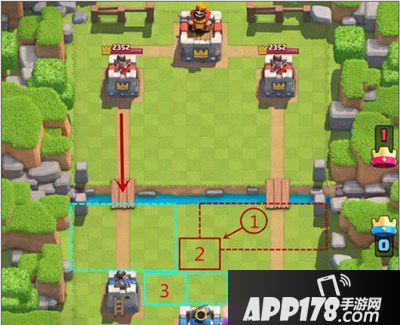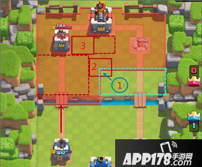 1、率先破掉对方一路后究竟有何优势呢?如图所示,破塔之后我们多了一块9*4大小的区域可投放部队。对方的黄金防守位此时变得很尴尬。我们可以从图中1号蓝圈的位置直接下兵去破解图中2号红框内的防御建筑,然后在优势区域不断下兵来压制对手。如果对手从这一路下兵进攻,我们也可以在对手部队接近河道时在其后方下兵来吸引对方部队的仇恨,有效积累圣水,组织下一波的进攻或防守。