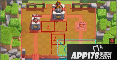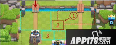 1、防守方面,如果对方进攻国王塔,尽量把兵力和防御建筑布置在国王塔前方而不是被破路的一侧,一方面这样可以最大限度地利用国王塔和护卫塔的输出协同防守,另一方面也可以牵扯对方部队的行进线路,起到阻碍对手进攻、拖延时间的目的。具体的下兵位置可参照下图3号框及其右边虚线框内的区域。