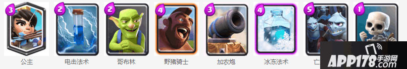 野猪骑士 + 哥布林 + 电击法术 + 加农炮 + 公主 + 亡灵大军 + 骷髅 + 冰冻法术