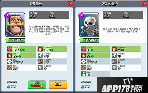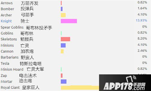 而排行第二第三的分别是骑士和骷髅兵,其实这两张卡相对于皇家巨人来说,实用性都非常不错。骷髅兵虽然生命值低,但是能引怪低费不卡手,使用好了能解掉不少威胁;而骑士血量伤害费用都比较平均、攻速较快,是张非常不错的近战部队,只是因为没什么特点,或者说特点不明显,因此使用这张卡的人比较少。