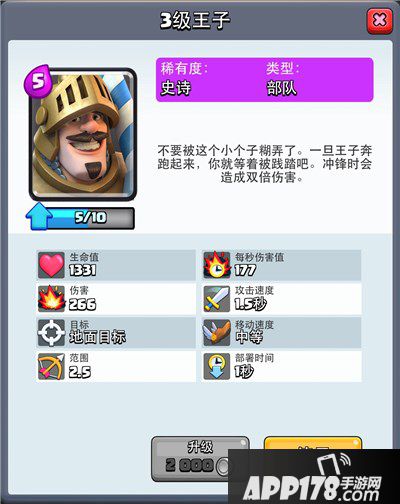 王子:套牌核心之二,当第一张紫卡开出王子时,这张卡就注定成为我的本命卡。王子攻守兼备,比普通近战的攻击距离要长,机动性好,唯一的缺点在于容易被杂兵勾跑,所以下王子的时机需要把握好,不然容易被对面成功赚费,这也是法术选择箭雨的一个原因,后面会说到。另外,当对面是巨人流,后排跟着法师、炸弹人之类,也能在对面过河后贴身下,清除掉远程兵,因为近战哥布林在这个时候就是送。
