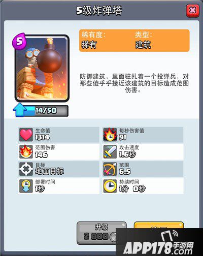 炸弹塔:关于防守建筑的选择,之前选择的是电塔,但电塔被削弱后,就不再使用了。这套牌的AOE是明显不足的,所有的随从都是单体伤害,这么选择是因为我想最大程度蹭到护卫塔的血量。所以在防守的过程中,需要补足AOE伤害,于是选择了炸弹塔。炸弹塔血厚,攻击高,配合毒药,防守起来效率高。
