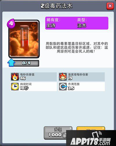 毒药:关于毒药的替换,我曾尝试过冰冻、火球、大闪电。大闪电最大的问题在于费用过高,同时对于防守的帮助在我看来不是很大,也就是不灵活,很容易卡手;火球则是一锤子买卖,范围小,如果预判不好,或者下的时机不对,很容易亏出翔;冰冻是目前的主流,但是如果不熟练的话,一旦出现空冰,就很容易崩盘。所以总体说来(所以因为本人菜,预判不好),选择了毒药。二级毒药的总体伤害跟火球差不太多,毒药的优点在于范围大,在面对房子流或者塔+圣水时,可以将对面建筑都笼罩到并一起蹭血(大多数情况一定要蹭到护卫塔的血),野猪进攻时,配上毒药,也可以蹭掉对面防守的小黄人、火枪的血量,帮助防御塔轻松补刀,还能蹭死哥布林和苍蝇群;毒药的另一个好处在于减速,当对面大举进攻时,在己方靠近河道处扔一发毒药,配合炸弹塔的AOE,远程的输出,防御起来不要太爽。