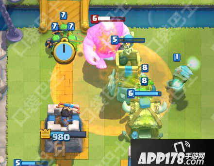 反过来想,怎么能让炸弹塔、炸弹兵等上述卡牌打不到我的人海呢?适当地加入肉盾,一般配巨人、骷髅海(超过4费就本末倒置了),一来可以挡着对方群伤兵的伤害,二来对方不得不用箭雨等法术来解,一旦对方使用法术,马上在另一路用骷髅海和哥布林突袭(此时对方一般没有解人海的牌了)