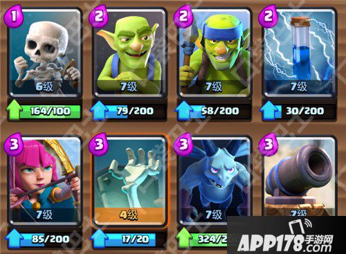 4、卡牌中还应该有低费的卡,低费卡有超高的机动性,可以帮你拖时间,另外还有刷牌的功能(刷牌是指,除了镜像外,你想要两张同样的卡一齐上场,必须将牌组刷过一轮),变相增强自己的攻防效率。低费卡一般是最后考虑的,是对其他牌的剩余漏洞进行补漏,要不哥布林、要不投矛手、要不骷髅(有水罐的情况下3费牌也可充当低费牌)。