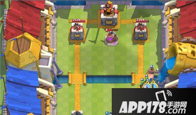 进攻思路:使用“跳猪”的技巧让野猪避开防御塔的吸引,直接攻击公主塔消耗其血量。将野猪和哥布林放在这个位置(下图),猪会直接跳过河道,中间的塔是不会吸引到野猪的,越过一些塔来祢补我这套路的进攻性不足。