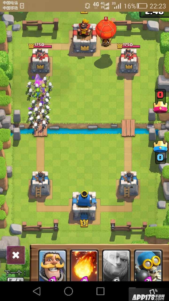 剩下的骷髅大军奋力冲向理查德的战场,理查德正好有3点圣水放出炸弹人将剩下的骷髅在塔前清光。炸弹人拿着个跟自己一半大的炸弹摇摆着前进快到桥边时,下了个迷你皮卡,一刀把炸弹人斩死,并在后面放了3个哥布林投矛手和火枪手,一波强力的攻势。